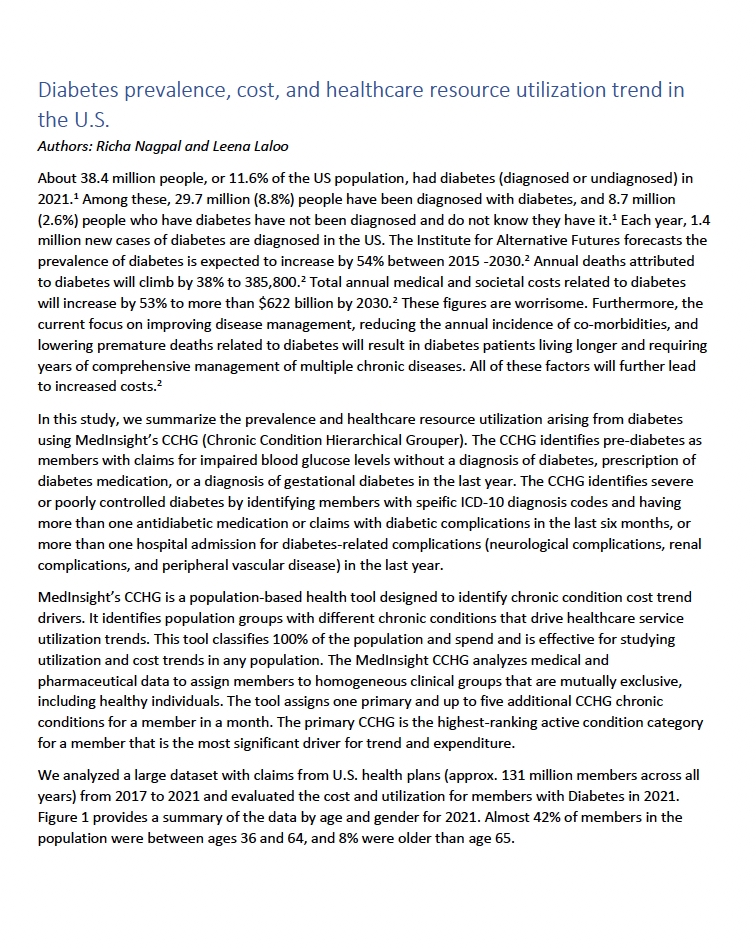 With the prevalence of diabetes in the U.S. forecast to increase 54% by 2030 and patients with diabetes living longer as the result of improved disease management, the healthcare system must grapple with the increased cost of care associated with this condition. Using MedInsight’s CCHG (Chronic Condition Hierarchical Grouper), this study provides a glimpse into … Diabetes prevalence, cost, and healthcare resource utilization trend in the U.S.