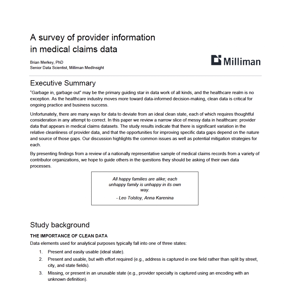 Clean data is critical for analytical work of all kinds, and healthcare claims data is no exception. In this whitepaper published by Milliman MedInsight, Senior Data Scientist Brian Merkey PhD, discusses the relevance of clean data for one narrow element in the healthcare data ecosystem: provider information in medical claims datasets. This work shares the … A survey of provider information in medical claims data