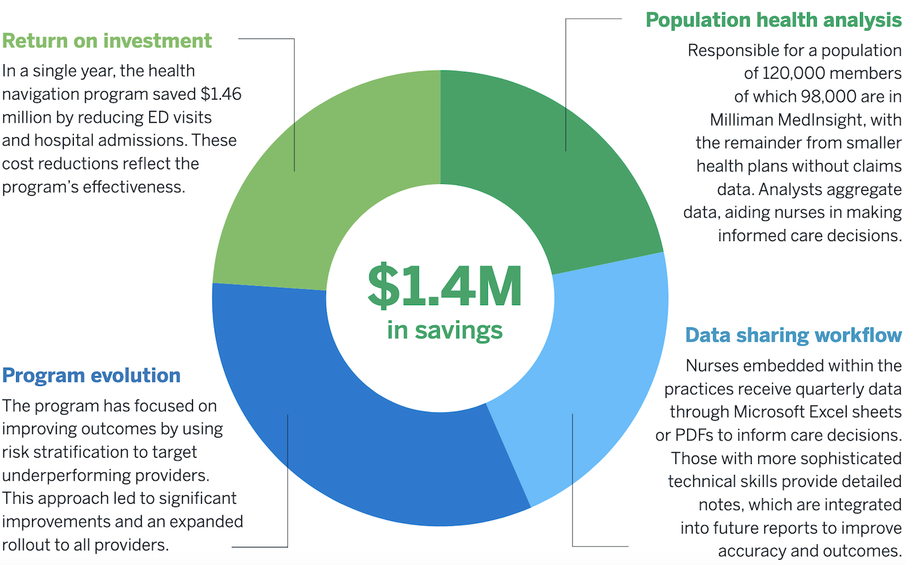 Working with analysts and leveraging the risk stratification tools in the Milliman MedInsight VBC Platform, nurses embedded within various practices were able to identify high-risk patients, even those without recent doctor visits. With teamwork, continuous feedback, and physician engagement, the program has improved care coordination and adoption across teams. It is a collaborative approach that has also driven enhanced patient engagement and fewer missed appointments, resulting in measurable ROI within one year.